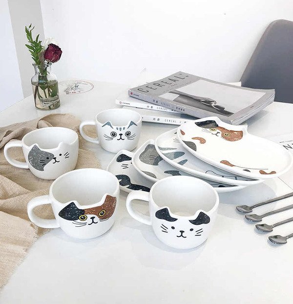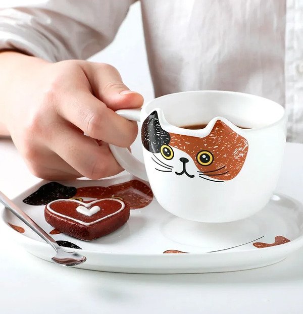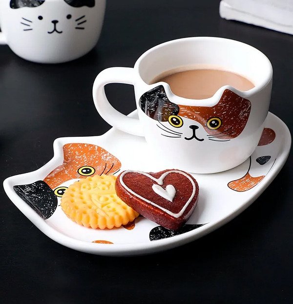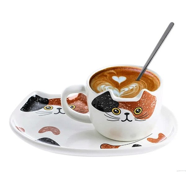 Hermoso y delicado set de cerámica excelente calidad. Diseño calico. Medidas plato: 19 x 13.5 cm. Taza: 8 x 7 cm